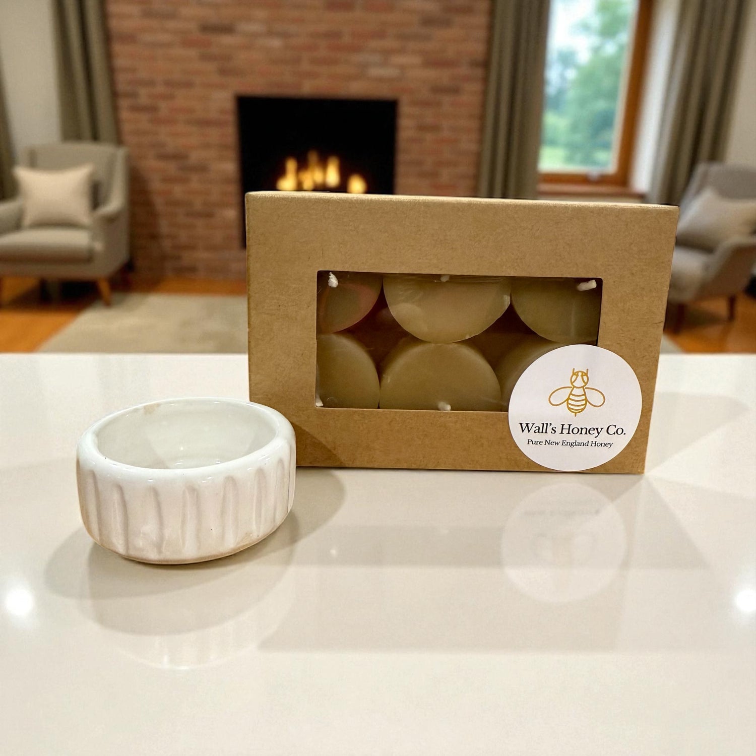 “Bianca” Pottery Tall Tea Light Beeswax Candle - Pack of 6.