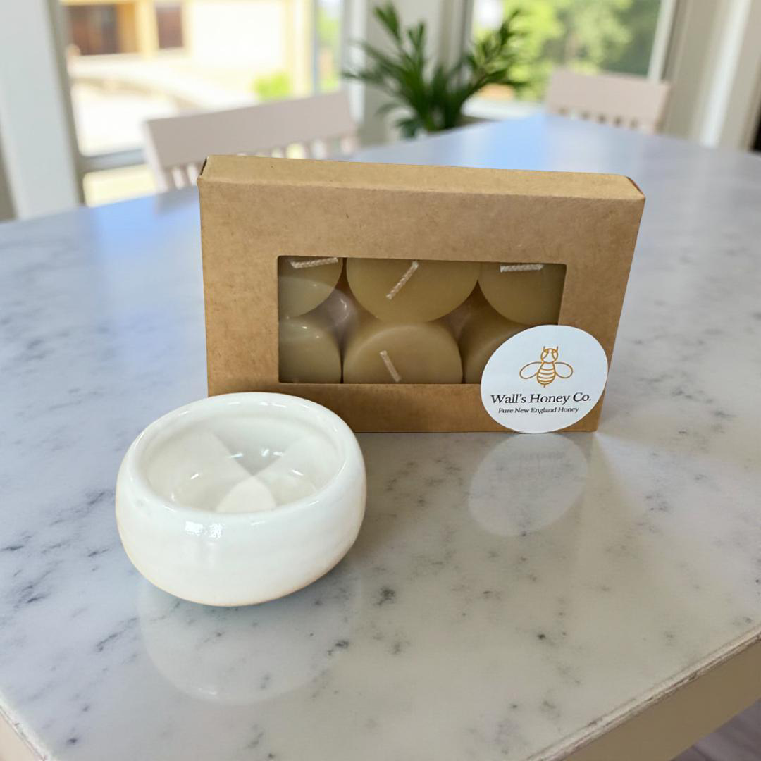 Tea lights + Pottery Holder Set – a complete, beautiful pairing of nature and craftsmanship. Contains 6 x beeswax candles and 1 x “Alice” one of a kind, locally made pottery candle holder
